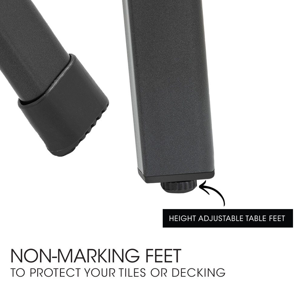 Crafted with a sturdy frame and protected by superior e-coating, it offers premium corrosion resistance and unmatched durability. Non-marking feet, including adjustable table feet, provide extra care for your tiles or decking.