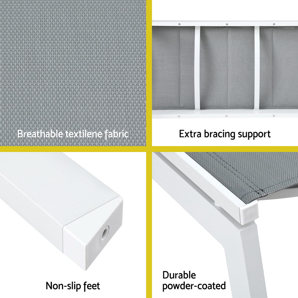 Make the most out of every sunny day with a Gardeon Sun Lounger. Made from breathable textilene fabric on a strong powder-coated aluminium frame, the lounger is sturdy and resistant to weather and corrosion. Non-slip feet and extra bracing support keeps the chair upright and stable with a 150kg weight capacity. 5 adjustable backrest settings offer you the perfect position to rest and relax. Smooth wheels make the chair easy to move and chase the sun. Best of all, the lounger is easily assembled and can be used anywhere such as the beach, the park, poolside or even indoors. Have more fun in the sun with a Gardeon Sun Lounger.